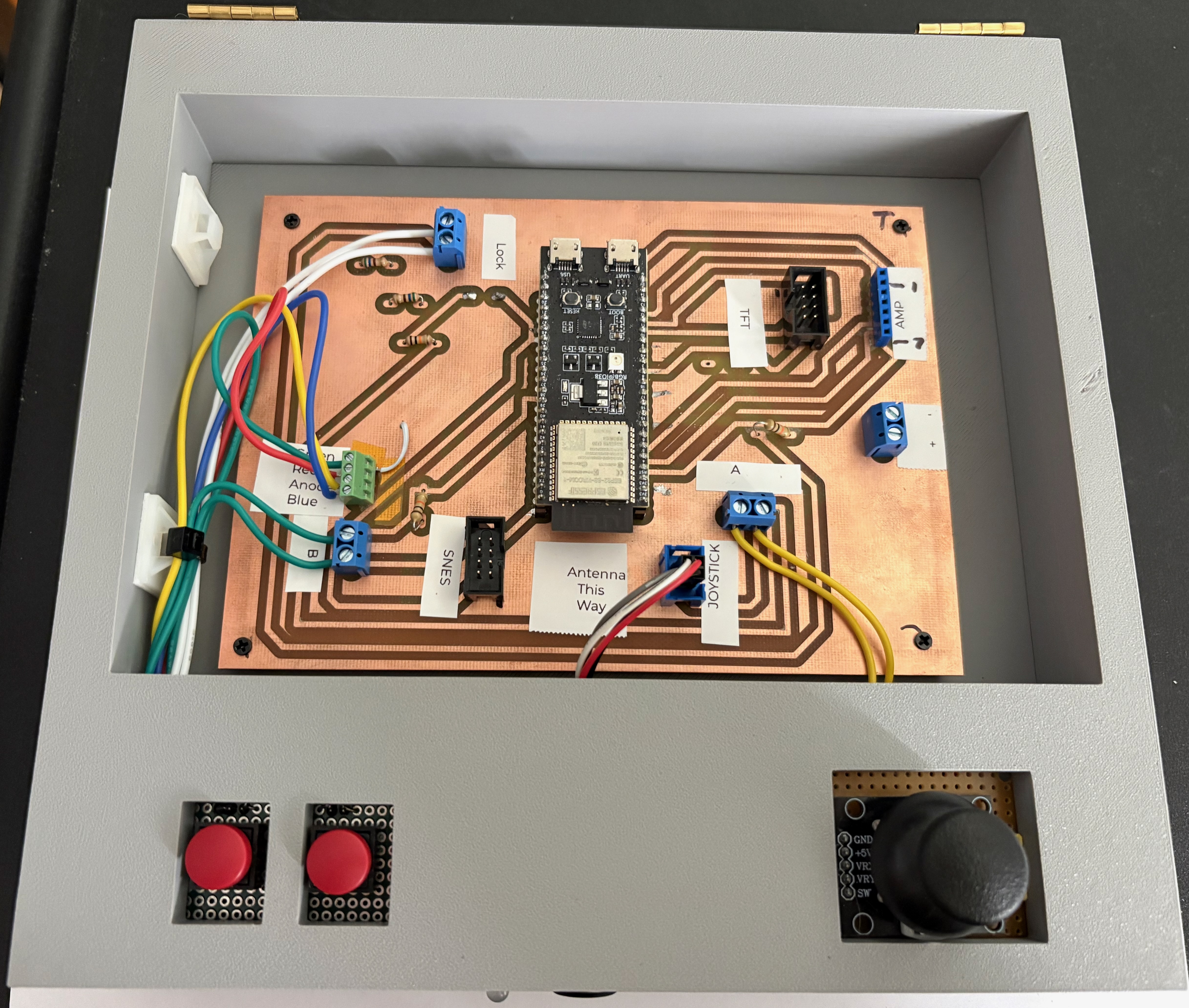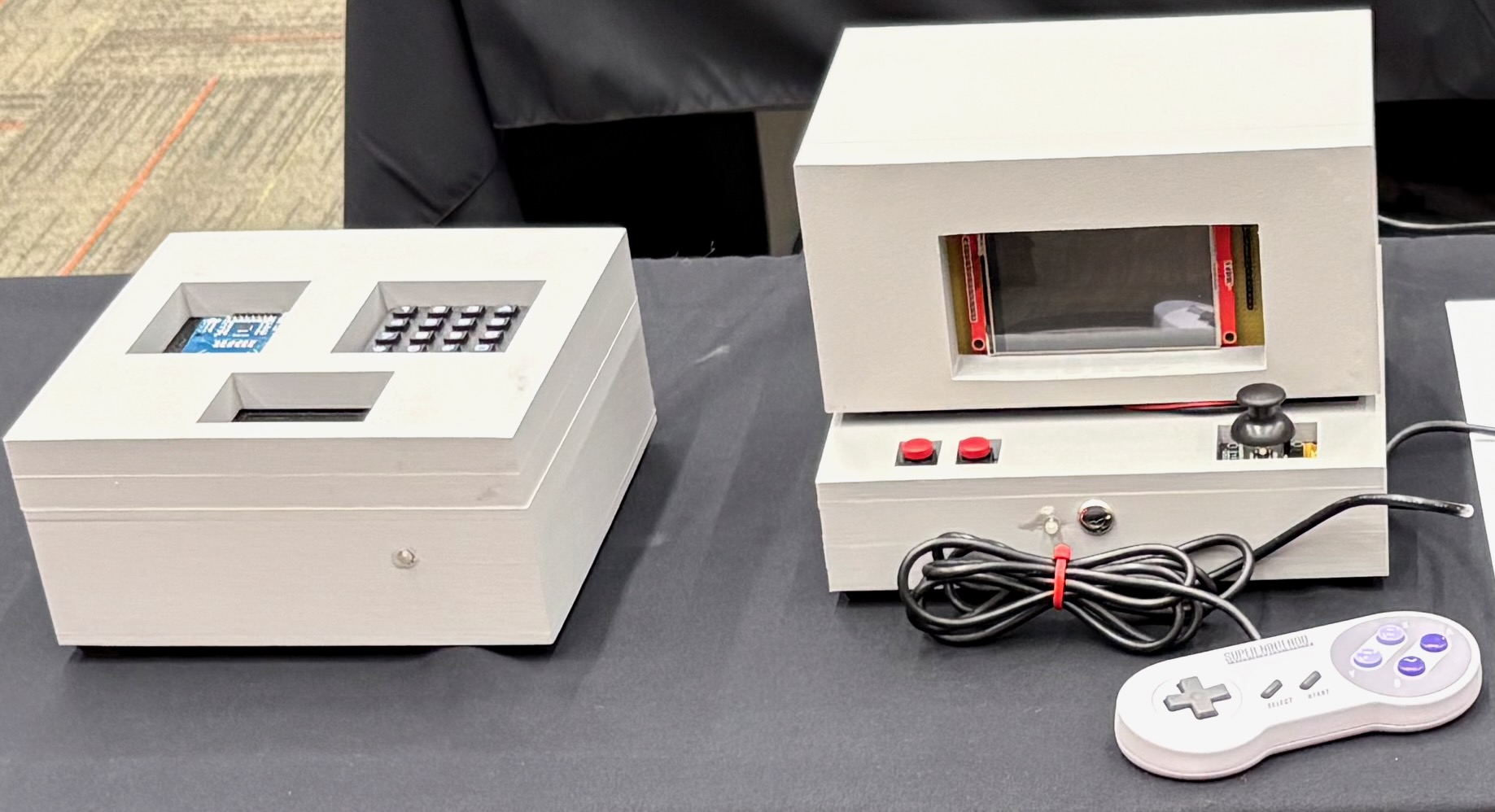 Our project used two ESP32-S3 microcontrollers; one for the main unit that controlled the game and another that played minigames on an LCD screen. We used the MQTT protocol to sync gameplay between the two units and included a PC application written in .NET to control the state of the game. The source code was written in C++ using PlatformIO an the Arduino framework; in all ~6700 lines of code were written across both units. It also featured support for a Super Nintendo controller for playing the mini games in addition to the built in joystick and buttons.