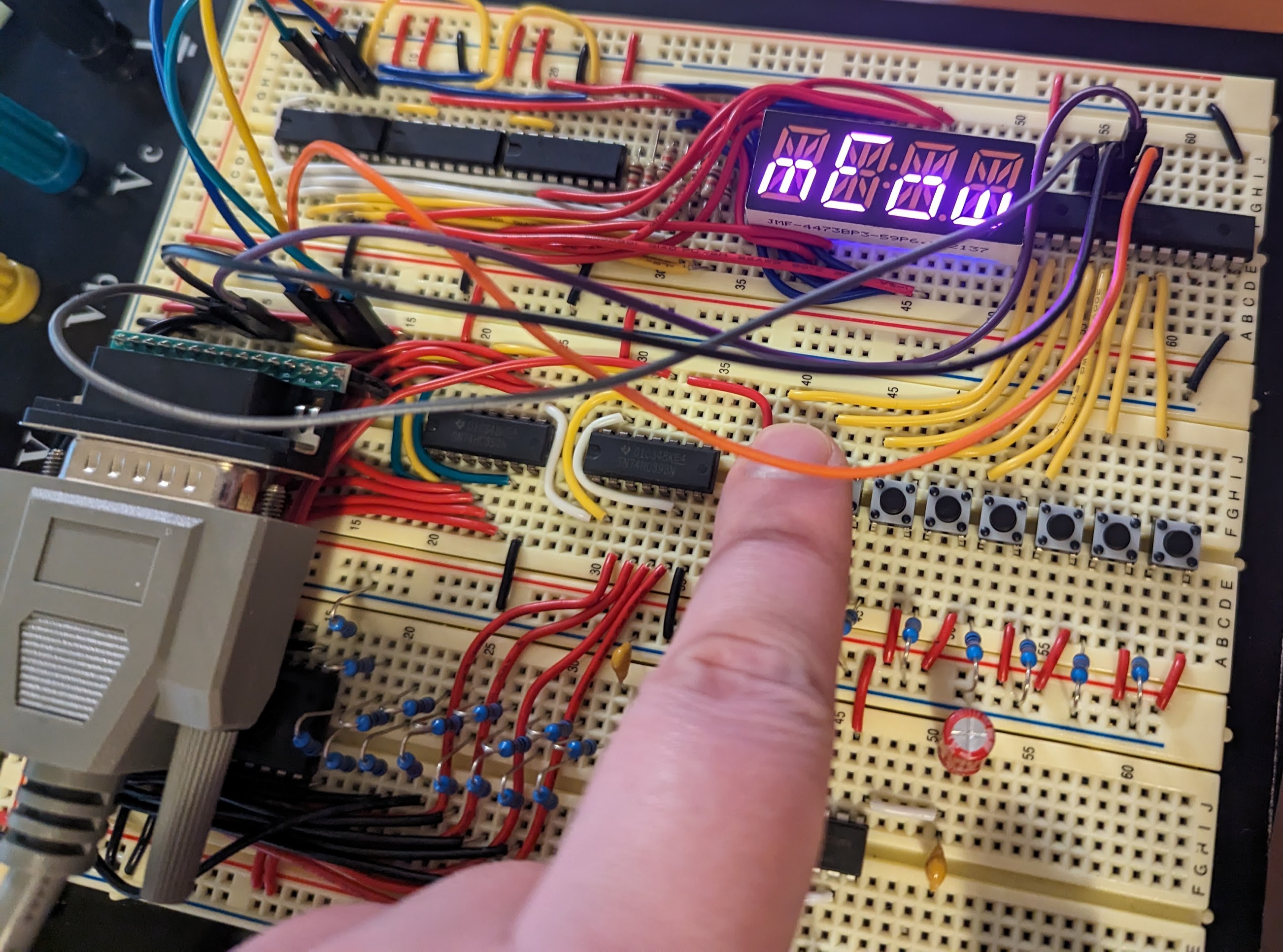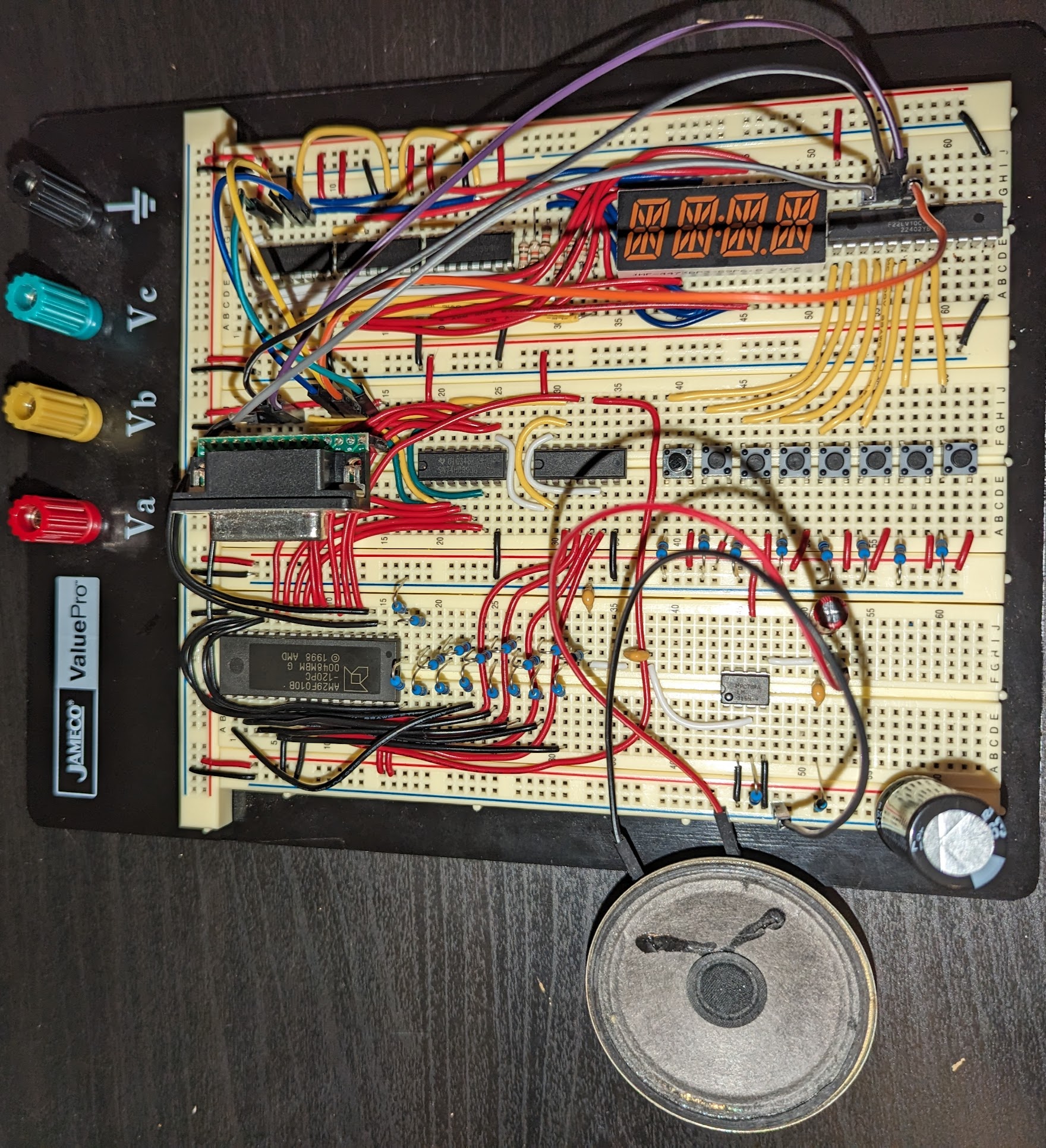 I was given an assignment to develop a project that demonstrated using multiple inputs and outputs that would be controlled by a LabJack U3. I decided it would be a fun idea to make a "cat piano" that would play different meows when different buttons were pressed, and display text on a 14 segment display. There wasn't that many pins available on the LabJack, so I used a GAL (Gate Array Logic) chip to help decode which button was pressed, and shift registers to drive the 14 segment display. The sounds themselves were stored on an EEPROM; each sample was stored as 8-bit PCM data and the data bus of the EEPROM went to an R2R ladder DAC and into an LM386 amplifier. To play the sounds, a timer was generated on the LabJack which was used to increment binary counters hooked up to the address lines on the EEPROM.